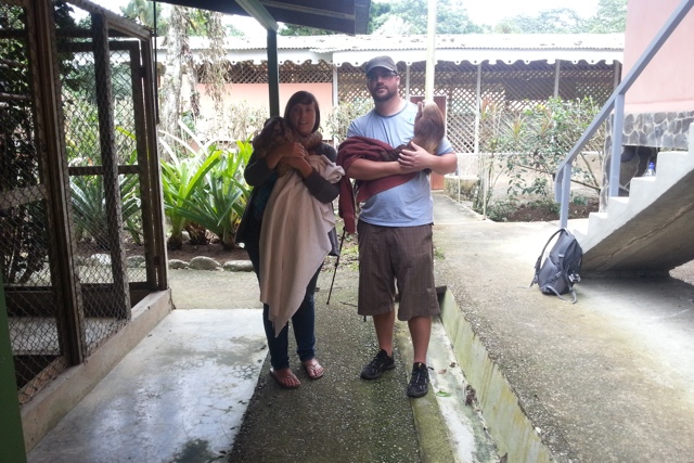 My friend Scott and I were in Costa Rica and we got the chance to hold Sloths. The guy asked if we wanted our photo taken… this is what we got. Why is it of our whole bodies? You can hardly even tell what we are holding! We are so far away! And the lighting is bad.
