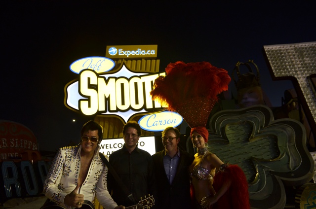 Jeff the Expedia.ca Light Up Vegas winner along with Elvis, Chris Day Director of Marketing for Expedia.ca and a Show Girl.